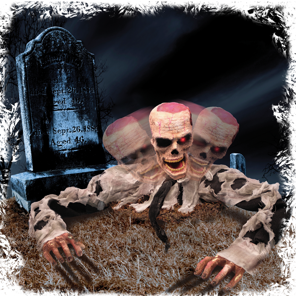 This hideous, rotting corpse is clawing his way out of the grave! With his scary moaning sounds, moving head, clawing hands, and a light-up eye, he is sure to be the most terrifying monster in the graveyard.