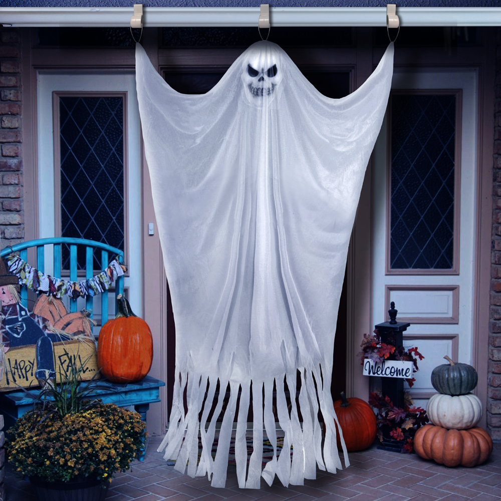 The 7 foot Gutter Ghost will make your house the spookist on the block! The ghost's scary skeleton face and long, flowing white fabric is sure to cause a fright. Attach the ghost to your gutters to complete your outdoor Halloween scene.