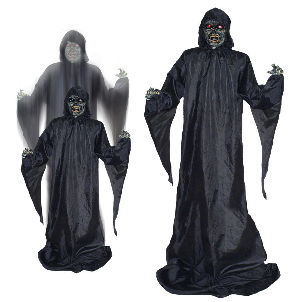 Sound Activated Reaper Rises To Over 6 Feet Tall And Sways From Side To Side While Moving Up And Down. He Has Light Up Eyes, Posable Arms, And Has A Frightening Laugh As He Wishes You A Happy Halloween!