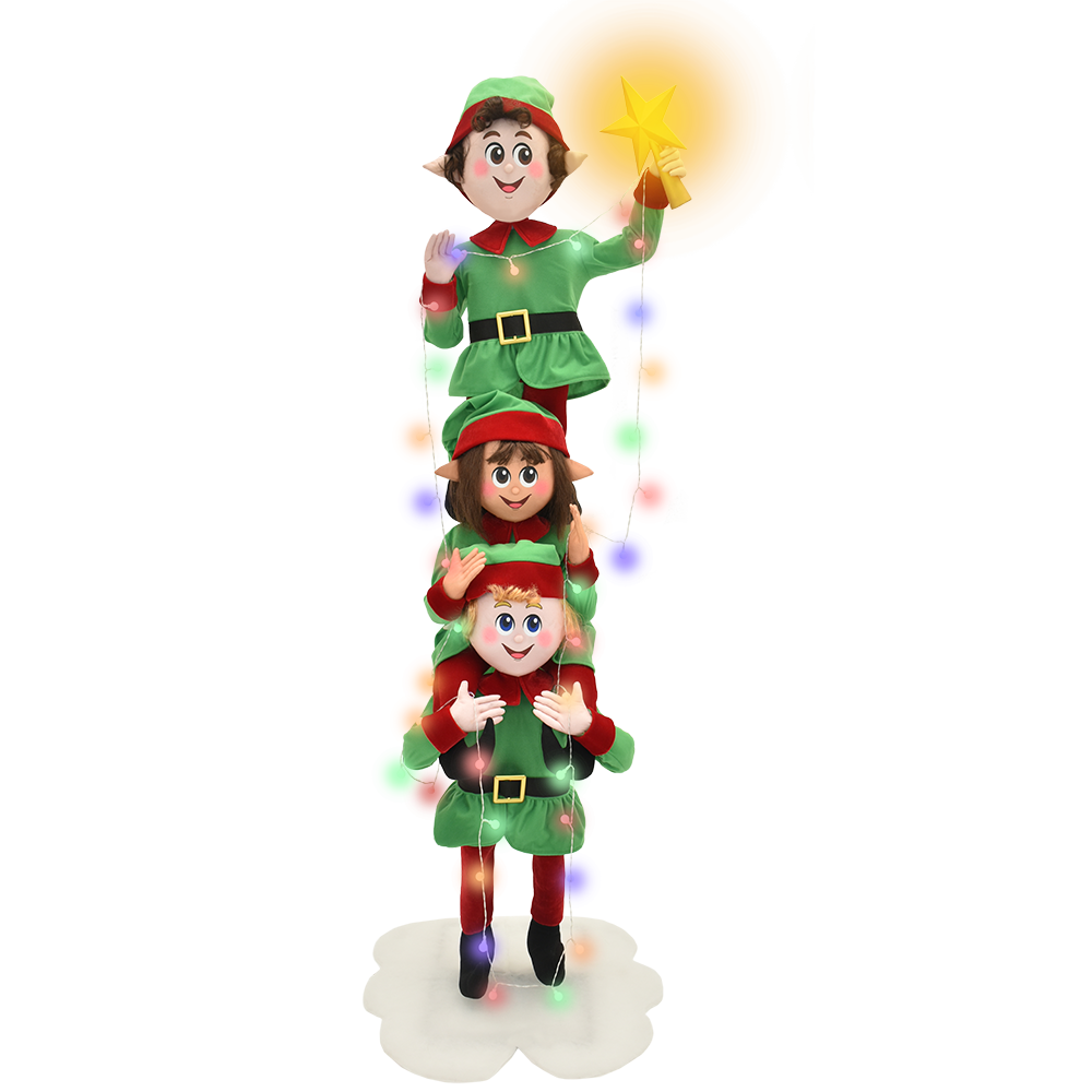 Three joyful elves stand on each other's shoulders to reach the tallest tree branch to decorate it with their glowing LED light string and star. This towering trio of toymakers are ready to light up your holiday with wonder and joy.